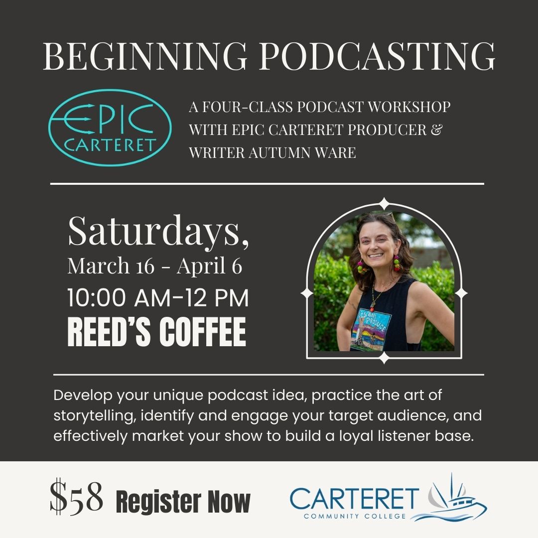 If you’d like to test the waters yourself, join me for “Beginning Podcasting,” a workshop series through the Carteret Community College Life Enrichment program designed for aspiring podcasters in the Crystal Coast community. I’m hoping I can give you an advantage in your own podcasting career with some of the knowledge and skills I lacked a year ago when I got started.