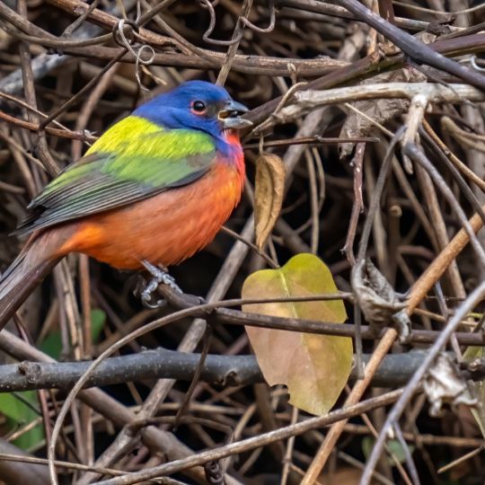 But the bird everyone wants to see, that everyone stalks like an A-list celebrity, is the painted bunting, especially the male. Unlike the female, the male isn’t a sitting target on a nest, so he can dress for the Mardi Gras and tempt birders with his rainbow plumage.